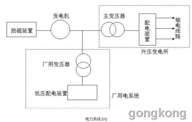 由汽輪機帶動發(fā)電機完成機械能轉(zhuǎn)化為電能,并且合理地實現(xiàn)發(fā)電、輸電、配電、供電和用電。發(fā)電機發(fā)出的電能大部分由主變壓器升高電壓,經(jīng)過高壓配電裝置和高壓輸電線路向外供電;其發(fā)出電能的一小部分作為本廠自用,稱作廠用電。
